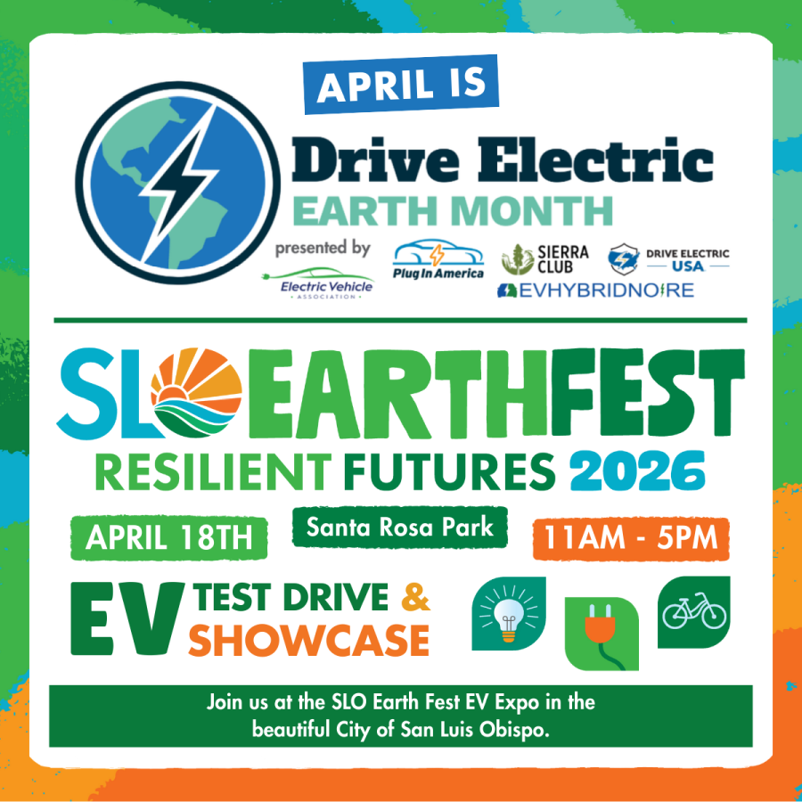 Join us at the SLO Earth Fest in Santa Rosa Park in the beautiful City of San Luis Obispo. Check out the the wide variety of electric cars that are now available in both the new and used car markets, talk to their owners, test drive the new 2026 crop of electric cars from Kia, Hyundai, Chevy, Honda and more. Learn how affordable EVs can be! And if a two-wheeled EV is in your future, we've got e-bikes, too. The Earth Fest will also have live music, a kid's zone, and a variety of activities for the whole family.