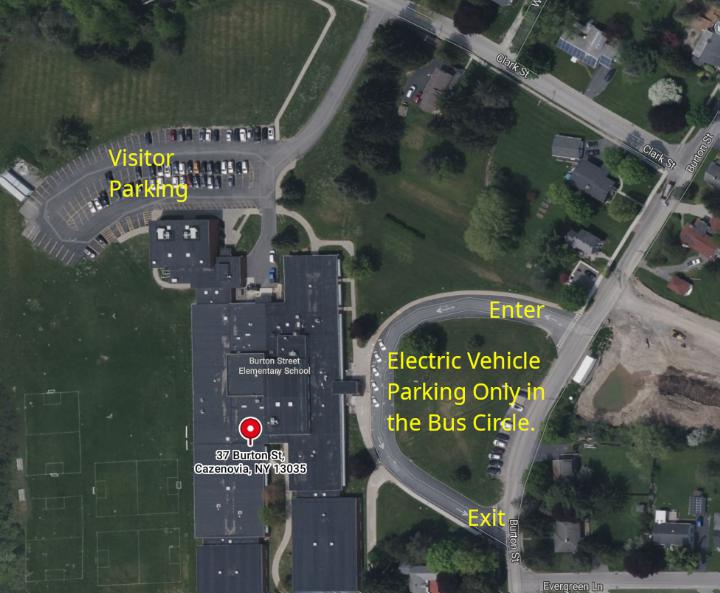 Organized and run by Electric Vehicle owners as a part of Earth Week activities coordinated by the United Climate Action Network and the Cazenovia High School Environmental Club, Cazenovia (and all of Central New York State) takes part in Drive Electric Earth Day, a free event from 10 am. until 3 pm. at Burton Street School at 37 Burton Street in Cazenovia, NY. The event is open to the public. Electric vehicle owners will display their vehicles and answer your questions. You can talk to owners, take a ride in an Electric Vehicle, or even drive one. You can view a list of the plug-in vehicles owner's registered to bring at the bottom of this page. Note: The bus circle is reserved for electric vehicles and other event vehicles, like a food truck and the Electric School Bus that will be there. Free parking is available off Clark Street behind the school. (See map below for details.)