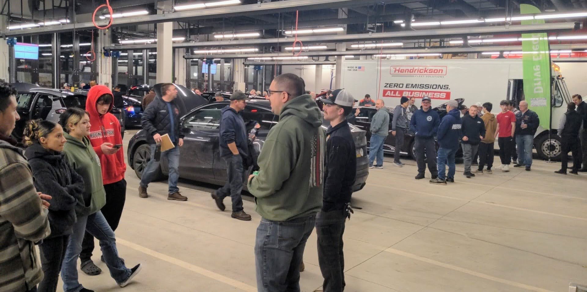 Firefighters from Somerville Fire Department and other emergency organizations gather around electric vehicles to inspect their electrical systems and architecture. Vehicles include Tesla Model Y, Hendrickson step van, Chevy Bolt EUV, Lucid Air and Tesla Model 3. Other EVs are not visible on this photo.